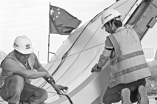 在浙江台州一建设工地上,作业工人正在进行地铁车站出入口钢结构铝板安装。