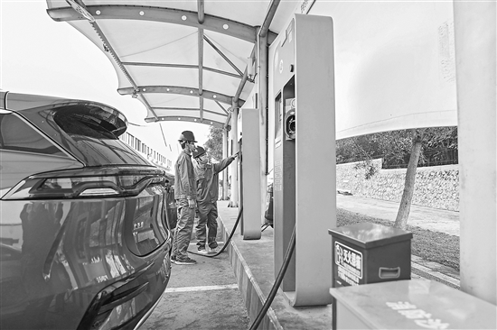 9月28日,工人在沪宁高速黄栗墅服务区检查充电设施运行情况。