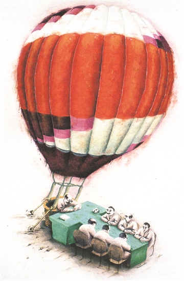这是一位热衷于开会的企业家,他乘坐热气球奔波于各连锁厂、店之间,来去匆匆开会频率极高,效果如何则是另一回事啦。