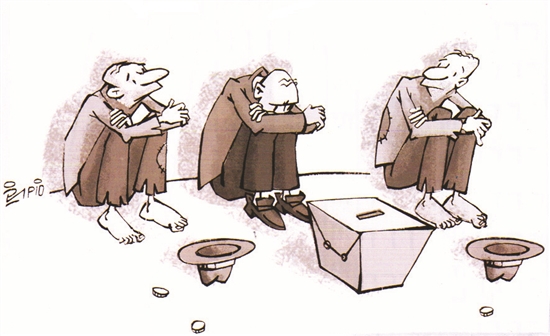 在西方,大选期间拉票,贿选似成常态,这位竞选者使出浑身解数未能如愿,故而与乞丐为伍,嘟囔着:“请您投票吧。”