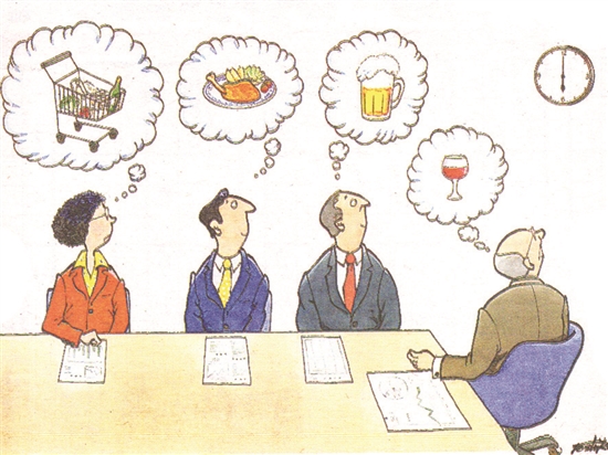 即将下班,铃响之前,人们各有所思,男士们想到了与朋友聚餐,美酒佳肴。女职员则规划着家庭中的方方面面,很多,很多……