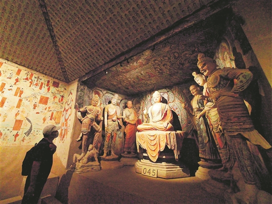 观众在3D打印复制的敦煌莫高窟第45窟内参观。