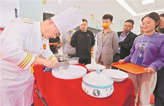 近日,江苏省扬州市总工会、市场监督管理局联合举办“名厨进名企,助力职工好食堂建设”活动,邀请中国淮扬菜大师杨军到扬杰电子公司职工食堂示范制作狮子头、文丝豆腐等菜品,并进行教学讲解。据了解,这一活动是为了提升职工食堂厨师的烹饪水平,为职工提供更好的饮食服务。本报通讯员 张丙涛 摄