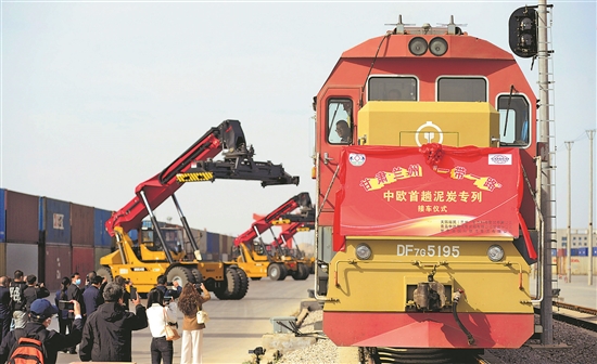 10月9日,兰州,首趟1200吨中欧泥炭专列进甘肃接车仪式在中川北站举行。