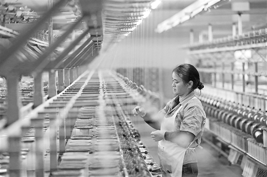 10月9日,一名工人在重庆市黔江区工业园区花神丝绸纺织有限公司生产车间进行并丝操作。近年来,重庆市黔江区将石漠化治理与蚕桑产业发展相结合,大量栽植桑树,并把蚕桑作为农民脱贫致富、乡村振兴的产业来发展。与此同时,当地充分利用优质桑蚕资源,引进龙头企业建起了丝绸工业园,把从当地农民手中收购来的蚕茧,加工成织绸、服装等产品,形成了养蚕、缫丝、丝绸服装于一体的全产业链。