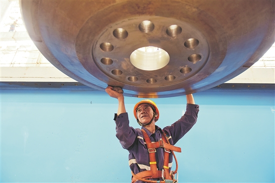 10月1日,湖北碾盘山水利水电枢纽工程发电厂房内,机电设备组装工作紧锣密鼓,工人们仰着脸不停地擦洗活塞轴盘。当被问到怎样才算达到清洁标准时,一个工人半开玩笑地说:“用手摸一下,感觉比脸还光滑就可以了。”