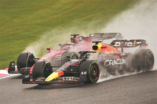 北京时间10日,维斯塔潘提前锁定本赛季F1车手总冠军。图为红牛车队荷兰车手维斯塔潘(前)与法拉利车队摩纳哥车手勒克莱尔在比赛中。新华社记者 张笑宇 摄