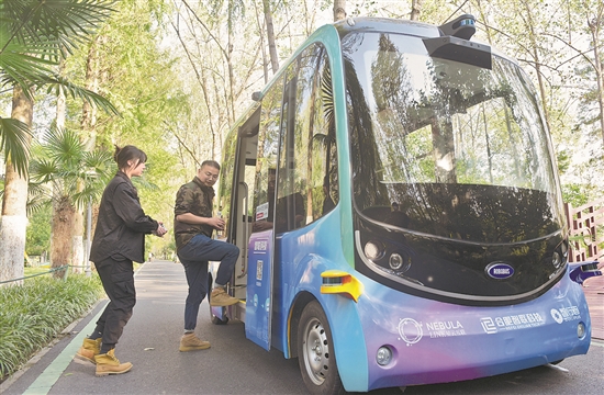10月11日,在合肥滨湖国家森林公园,游客准备乘坐自动驾驶观光车。