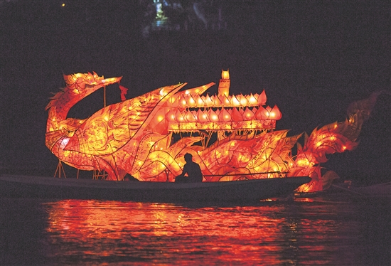当日,琅勃拉邦庆祝灯船节。人们用花灯点缀城市,在湄公河上放龙舟灯船,寄托美好的祝福。新华社发(凯乔 摄)