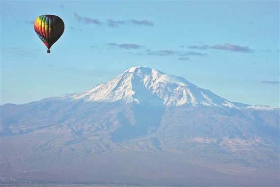 当地时间2022年10月12日,亚美尼亚科塔克,在“从天空发现亚美尼亚”国际热气球节期间,气球爱好者在加尔尼定居点附近的天空中放飞热气球,背景是亚拉拉特山。来自亚美尼亚、巴西、保加利亚、德国、哈萨克斯坦、波兰和俄罗斯的参与者参加了这个节日。视觉中国 供图