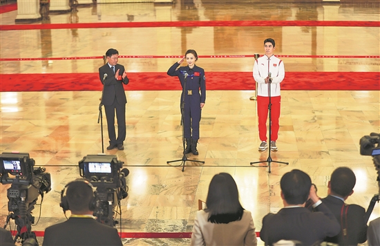 在第一组中,回答完记者提问的英雄航天员王亚平代表(中)受到旁边朱有勇代表(左)和武大靖代表(右)鼓掌致敬。