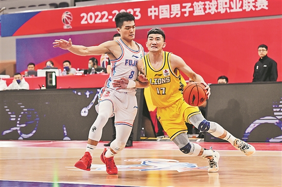 10月17日,在杭州进行的2022~2023赛季中国男子篮球职业联赛(CBA)第一阶段第四轮比赛中,浙江东阳光队以105比83战胜福建浔兴股份队。图为浙江球员孙铭徽(前右)在福建球员黎伊扬的防守下突破。