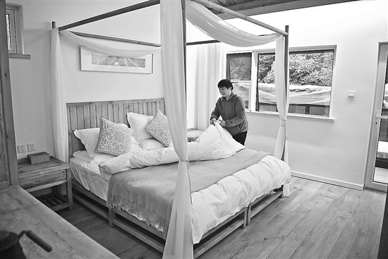 在宁陕县广货街镇沙沟村由闲置破旧农房改造而成的民宿中,村民张胜霞在整理卧室床铺。