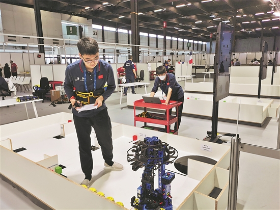 10月19日,中国选手在法国波尔多参加世界技能大赛特别赛移动机器人(双人)项目比赛。