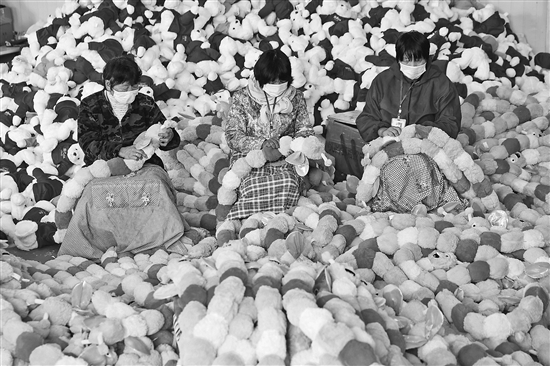 10月21日,江苏省连云港市赣榆区城头镇一家玩具企业员工在赶制出口欧美市场的玩具。距离新年还有两个多月,这里玩具订单猛增,近百家玩具企业进入新年用品生产和销售的高峰期。