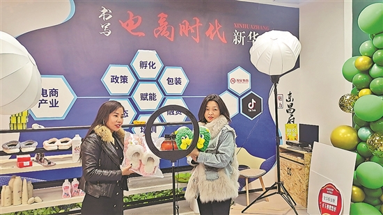 近年来,山东莘县妹冢镇联合柿子园镇抱团发展,搭建“农户+电商站点+客户”电商配送新路径,扩大网销渠道,帮助脱贫群众增收,助力乡村振兴。图为当地乡镇电商企业正在直播销售帮扶产品。本报通讯员 孙伟 付研 摄
