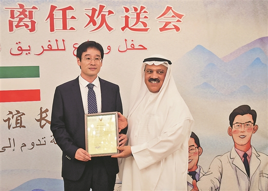 10月24日,在科威特首都省,中国援科医疗队队长王振华(左)在离任欢送会上接受科威特自然康复医院院长萨拉赫的感谢信。王振华说,中国援科医疗队给当地民众和医生留下了深刻印象,让他们对中医和中国文化有了进一步了解。医疗队也教授当地不少人初步的中医治疗方法,给当地留下了一支“带不走”的医疗队。新华社记者 尹炣 摄