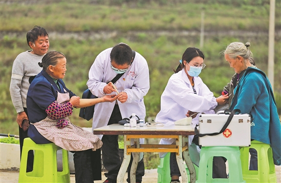 “家庭医生”正在给村民免费检查身体,并提供健康咨询、用药指导等服务。