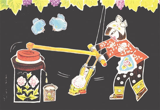 《一举两得》创作于30年前。5年前笔者去郝先生设在村里的漫画创作基地采风时,这样的场景已经不多见了。说不定当年在磨房里荡秋千的娃娃已经身为人母了,没准儿她已经去城里生活了。她或许在用豆浆机给母亲做豆浆,或许直接去连锁餐饮机构买上几杯,顺便让自己的娃娃在商厦里面体验各种游乐项目。