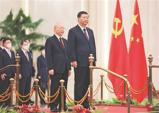 阮富仲表示,非常感谢习近平总书记邀请我率领越方领导人作为中共二十大后第一个元首级代表团访华,我也实现了向习近平总书记同志作出的将中国作为我连任越共中央总书记后首访国家的承诺。我代表越南党、政府和人民就中共二十大成功举行向中国党、政府和人民表示热烈祝贺,对习近平总书记同志再次当选中共中央总书记表示热烈祝贺,这充分体现了中国党和人民对过去十年在以习近平同志为核心的党中央坚强领导下,在习近平新时代中国特色社会主义思想的指引下,中国取得的巨大发展成就和崇高国际威望的高度认可和信赖。中国共产党取得的成就为世界发展中国家特别是走社会主义道路的国家提供了宝贵经验。我们坚信,在以习近平同志为核心的中共中央领导下,中国一定会实现中共二十大确定的目标任务,为地区和世界作出新的积极贡献。