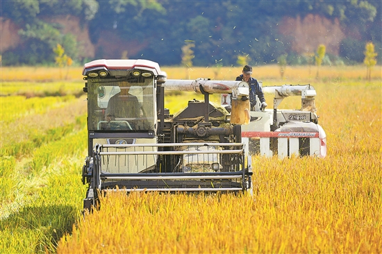 11月1日,浙江省德清县洛舍镇矿基地复垦项目的3000余亩晚稻田,村民驾驶收割机在收获晚稻。洛舍镇东衡村曾是石材生产基地,2009年矿山关闭后留下大片废弃矿地,后来通过综合整治,废弃矿地变成连片良田。本报通讯员 王正 摄
