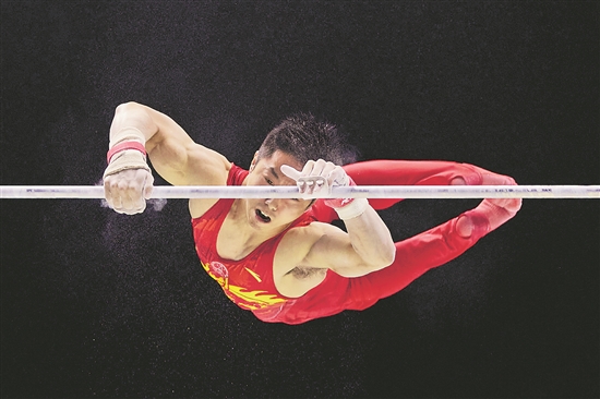 中国队在第一个进行的单杠项目上表现出色,孙炜和张博恒分别拿到14.833和14.733分,在所有参加这一项目的选手中分别排在第二和第三位。