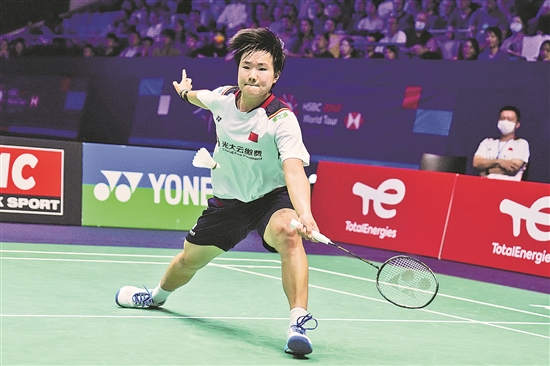 北京时间10月31日,在法国巴黎举行的法国羽毛球公开赛女子单打决赛中,中国选手何冰娇以2比1战胜西班牙选手马林,获得冠军。图为何冰娇在比赛中回球。