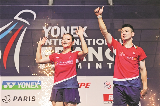北京时间10月31日,在法国巴黎举行的法国羽毛球公开赛混合双打决赛中,中国组合郑思维/黄雅琼以2比1战胜荷兰组合塔博林/皮克,获得冠军。图为郑思维(右)/黄雅琼在颁奖仪式上。