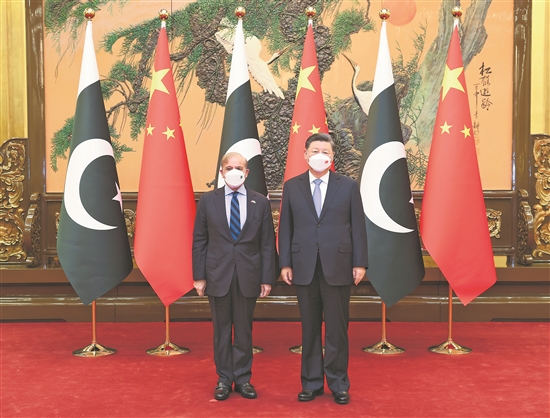 习近平介绍了中国共产党第二十次全国代表大会取得的重要成果。习近平指出,中国将继续坚持对外开放基本国策,不断以中国新发展为包括巴基斯坦在内的世界各国提供新机遇。中方愿同巴方深化发展战略对接。双方要用好中巴经济走廊联合合作委员会机制,以更高效率推进中巴经济走廊建设,将其打造成“一带一路”高质量发展示范性工程。要加快推进瓜达尔港配套基础设施建设,发挥港口对地区联通发展的辐射带动作用。双方要共同努力,为早日实施一号铁路干线升级改造项目和卡拉奇环城铁路项目创造条件。中方欢迎巴基斯坦扩大优质农产品对华出口,愿同巴方拓展数字经济、电子商务、光伏等新能源合作,扎实推进农业、科技、民生等领域合作,将继续为巴方稳定金融形势提供力所能及的支持。中方支持中国工业强省同巴方结对子推进产业合作,希望巴方提供良好营商环境。我高度牵挂在巴中国人的安全问题,希望巴方为赴巴基斯坦开展合作的中国机构和人员提供可靠安全环境。