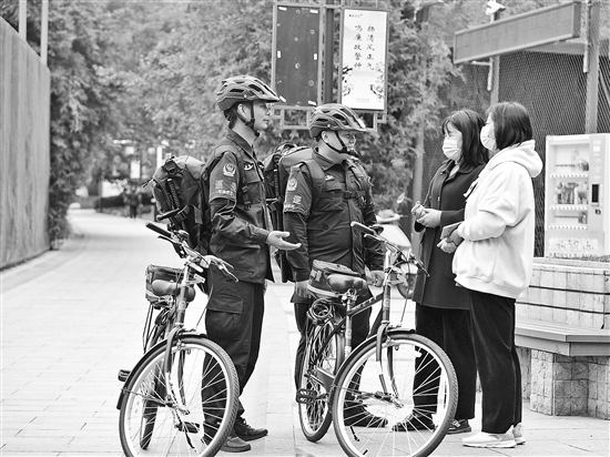 为进一步完善社会面治安巡逻防控工作机制,安徽省马鞍山市当涂县公安局特(巡)警大队在全市范围内率先购置10辆警用自行车,全面推行警用自行车巡逻新模式。图为10月26日,当涂县公安局特(巡)警大队警用自行车巡逻组巡逻队员在重点区域、背街小巷开展安全防范宣传。卫学超 摄/人民图片