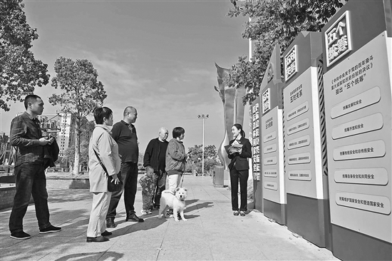 10月24日,江西宜春,万载县人民法院法治宣传员正在给市民做法治安全宣讲。近年来,江西省宜春市万载县在公园中的一些闲置空间竖立法治宣传栏,将其打造成集生态、健身、休闲、赏景、学法等功能于一体的“口袋公园”,使普法宣传更贴近群众。