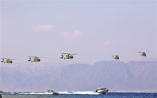 11月1日,在约旦亚喀巴,约旦特种部队在国际特种作战部队武器装备展开幕式上展示海上反恐演练。
