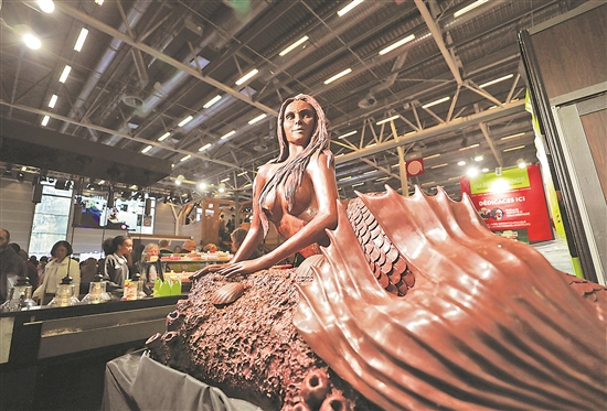 第27届巴黎巧克力沙龙于10月28日至11月1日在法国巴黎凡尔赛门展览馆举行。本届展会吸引了200多家来自世界各地的展商参展。这是10月31日在巴黎巧克力沙龙上拍摄的巧克力美人鱼。