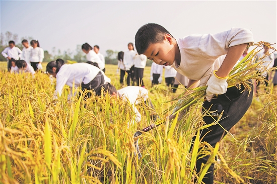 秋收时节,湖南省常德市桃源县寺坪中学在农田开展“田间课堂”活动,学生们体验收割水稻、观看农机作业,学习粮食相关知识,感受劳动的艰辛和丰收的喜悦。