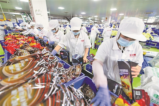 11月7日,在柳州螺蛳粉生产集聚区广西善元食品有限公司生产车间,工人在包装产品。