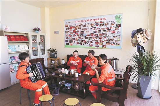 海沧城建市政工会爱心驿站,环卫工人们在此弹琴唱歌。(李菁 摄)