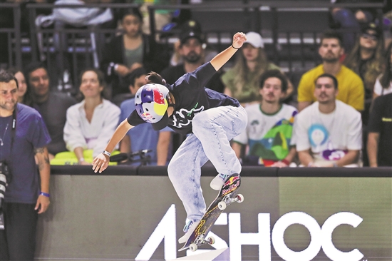 北京时间11月7日,在里约热内卢举行的街式滑板联赛“超级王冠赛”决赛中,中国选手曾文蕙获得第六名。“超级王冠赛”是街式滑板联赛的年终总决赛,被认为是职业滑板领域的重要赛事之一。图为曾文蕙在比赛中。新华社记者 王天聪 摄