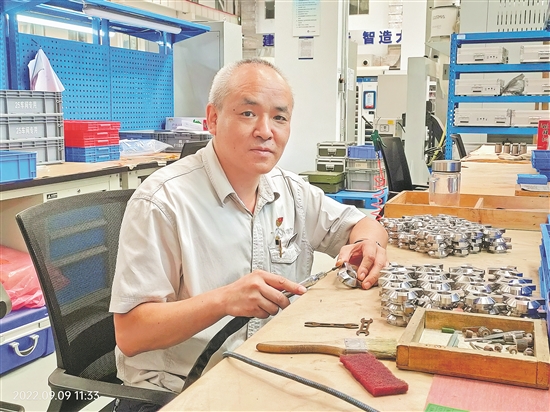杨峰在对阀门零件进行“精雕细琢”,手工去除机械加工后残存的毛刺。