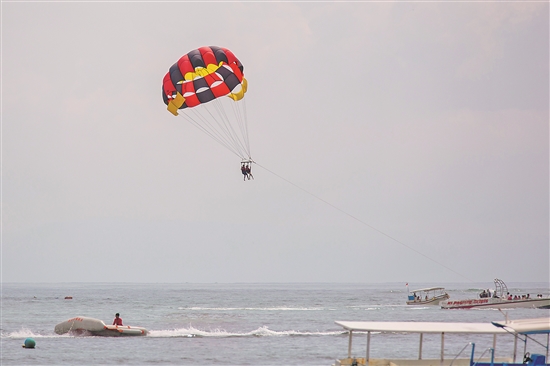 当地时间11月12日,在印度尼西亚巴厘岛丹戎伯诺阿海滩,游客体验水上帆伞运动。