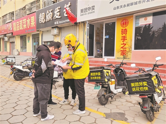 今年以来,聊城市总工会积极推进外卖送餐员等新就业形态劳动者入会工作,并引导外卖送餐员参与治安防范、防诈骗宣传和疫情防控等社会治理活动。目前,已发放防诈骗知识宣传单8000余张、防疫知识宣传单1.5万余张。本报记者 田国垒 本报通讯员 朱琳 摄