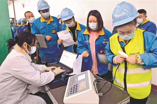 11月15日,江苏江阴靖江工业园区卫生院为大明靖江沿江制造基地1300余名员工体检。此次体检包含内外科、心电图、肺功能等项目。体检后,院方将依据体检结果给出相应的预防建议和措施,减少职业危害,为劳动者健康保驾护航。视觉中国 供图