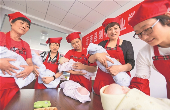 日前,山东省沂南县总工会举行“沂蒙月嫂进北京”欢送仪式,又一批优秀月嫂奔赴北京工作。图为数位沂蒙月嫂接受岗前培训。