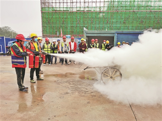演练模拟工地发生火情,以实操训练为主,组织参演人员进行现场使用干粉灭火器灭火,消防水带连接附近消防栓使用水枪灭火,移动水箱车使用车载消防水炮灭火等消防技能训练项目,进一步提升工程项目人员消防安全素质和应急处理能力,为工程建设筑牢“防火墙”。吴斐 罗超 摄
