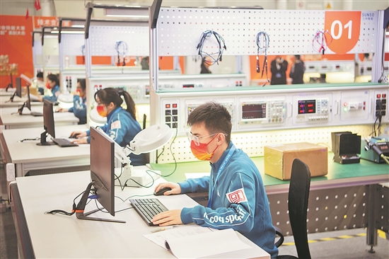 11月17日,参赛选手在电子技术项目比赛中。当日,湖北省第一届职业技能大赛在武汉国际博览中心举行。来自90余家企业、院校的选手竞技,参加3D数字游戏艺术、信息网络布线、机器人系统集成等技能的比拼。新华社记者 伍志尊 摄
