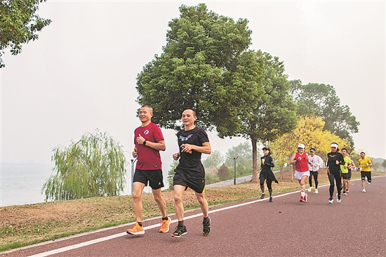 近日,市民在常德柳叶湖旅游度假区跑步锻炼。