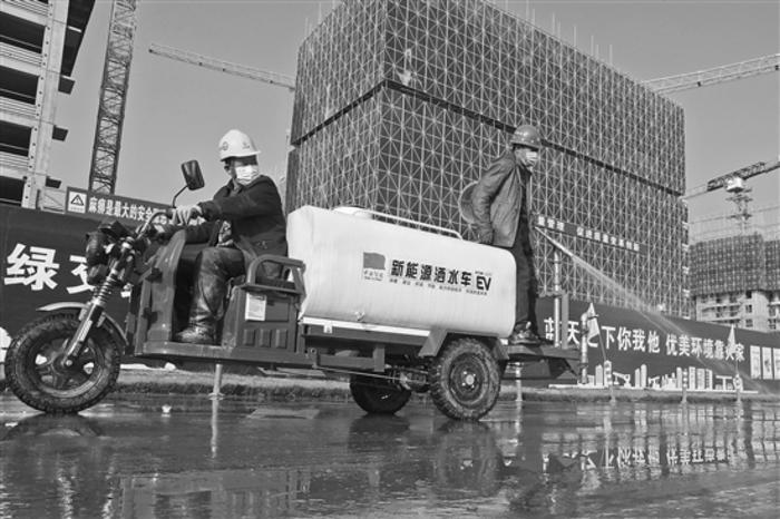 11月17日,在北京市通州区张家湾棚改项目建设工地上,工人们正在用洒水车冲洗地面,减少扬尘。