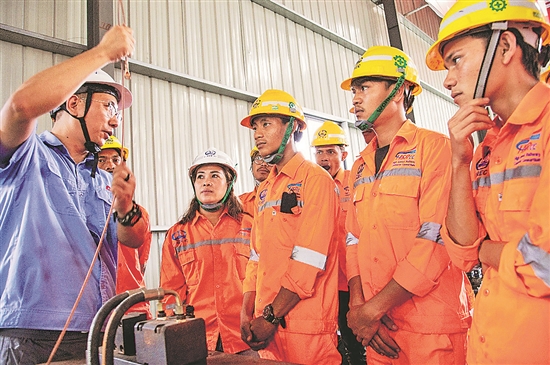 图为高铁电气工程师王浩(左一)在中铁电气化局雅万高铁资源管理中心进行“简统化”接触网系统技术服务。张磊/文 焦宏涛/摄