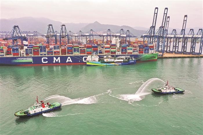 11月22日,在深圳盐田港,C型罐式LNG加注船“新奥普陀号”为法国达飞集团的双燃料集装箱船“达飞·索邦”号加注LNG燃料。这实现了深圳市国际航行船舶LNG首船加注,深圳港由此成为全球第四、华南首个具备LNG加注服务能力的枢纽港。新华社记者 毛思倩 摄