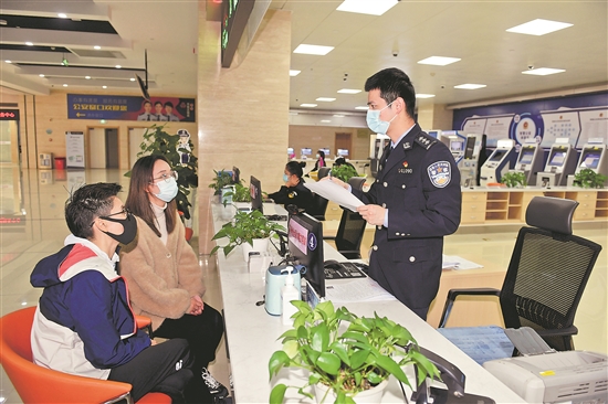 11月22日,在新昌县公安局出入境管理大队办事窗口,工作人员向一名智利籍足球教练(左一)介绍居留延期政策。