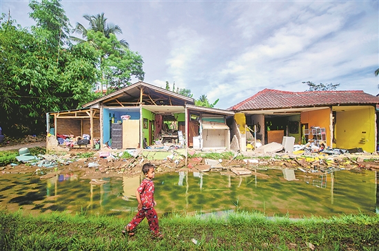 11月23日,在印度尼西亚西爪哇省展玉地区的地震灾区,一名儿童从受损房屋旁走过。